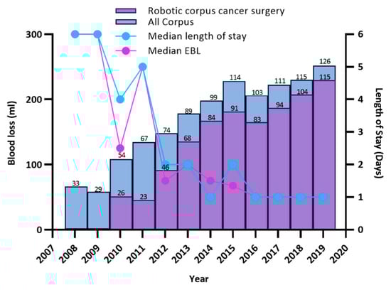 Between 1 January 2010–31 December 2019, 952 patients underwent primary surgery for corpus cancer. Table 1 describes the patient demographics, surgical procedures and outcomes. Using the Da VinciTM robotic system; 734 procedures were performed, with an overall conversion rate of 0.5%, after docking robot, or 1.7% if conversions to laparotomy following initial laparoscopic assessment are included (robot not docked). Median estimated blood loss (EBL) for the robotic cohort was 50mL, median Length of stay (LOS), 1 day and 30-day mortality was 1/734 (0.1%). Open surgery was performed in 164 cases with a median EBL of 500mL, median length of stay 6 days, 30-day mortality 5/164 (3.0%). In this 10-year period 54 patients underwent total laparoscopic hysterectomy (48), laparoscopic assisted (3) or vaginal hysterectomy (3) This “Other MIS” group had a median EBL of 100 mL, median length of stay 2 days, 30 day mortality 1/54 (1.9%). Figure 1 shows the relationship between the numbers of cases of robotic surgery for corpus cancer to length of stay and blood loss.