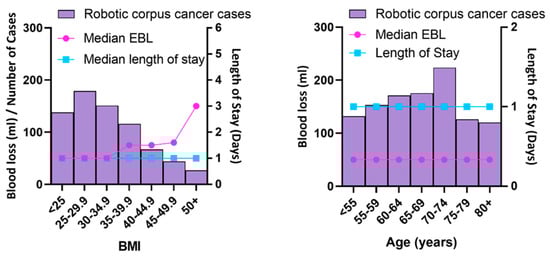Robotic Cohort—Association between BMI/Age and Median EBL/Length of stay (LOS).