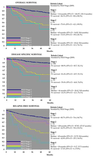 Robotic Cohort—Overall, Disease Specific Survival & Relapse Free Survival by FIGO Stage (2009).
