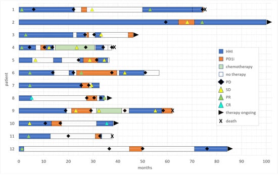 HHI therapy was reinduced within a median of 18.3 months after discontinuation of initial HHI treatment (range from 3.8 to 69 months), and within a median of one month after discontinuation of PD1i treatment (range from 0 to 22.6 months). One third of patients had an objective response to the second HHI treatment, including three patients with PR (25%) and one patient with CR (8%). Six patients (50%) achieved a SD, two patients (16%) a PD. The median treatment duration was 3.6 months (range from 1 to 29 months). In total, seven patients had to discontinue the treatment with reinduced HHI, mostly due to progression (five patients, 42%), but also due to intolerable AEs (one patient, 8.3%) or patient request (one patient, 8.3%). Among these, five patients received subsequent systemic treatments. The remaining five patients are still on treatment with reinduced HHI. An overview of treatment sequences is summarized in Figure 1. Figure 2 depicts one exemplary clinical course (patient 7).