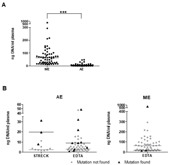 Manual and automated extraction leads to different cfDNA concentrations. (A) cfDNA content in automatically and manually extracted (AE; ME) cfDNA of directly processed EDTA-sampled plasma were significantly different (***: p < 0.0001). (B) Following AE, cfDNA concentrations are higher in mutation-positive samples compared to negative samples. Opposite results were observed in ME cfDNA samples. Horizontal lines: median for specific groups.