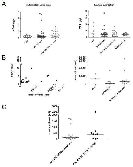 Impact of tumor localization and tumor volume on cfDNA concentration and detection of KIT/PDGFRA mutations. (A) Correlation of cfDNA concentration with location of metastasis divided by isolation methods. (B) Tumor volume did not correlate with cfDNA amounts (isolated manually). Tumor volume and localization of disease did not correlate. Triangle: primary mutation found. (C) Tumor volume was higher in patients with any detectable KIT mutations (not significant). Horizontal line displays median.
