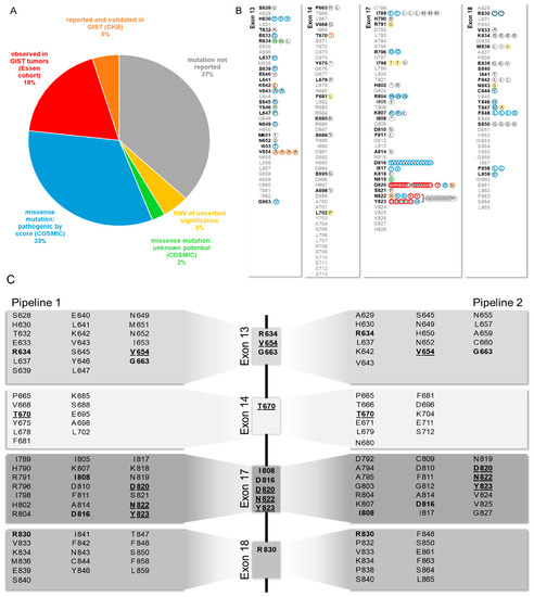Distribution of KIT Mutations in exons 13, 14, 17, 18 found in patient plasma samples and clinical significance. (A) Distribution of clinical significance by manual database search. (B) Distribution of KIT mutations found by Pipeline 1, color code adopted from (A) Del: deletion, stop codon. (C) Analysis of sequencing data using two different pipelines. Pipeline 1: routine pathology pipeline; Pipeline 2: research pipeline. Mutations found by both pipelines displayed in the middle. Bold: found by both pipelines, underlined: Loci for known GIST resistance mutations.