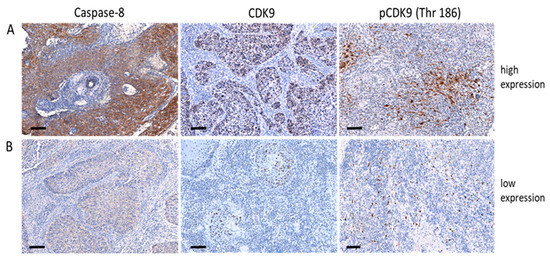 Examples of cervix cancer biopsies with immunohistochemical detection of high (A) and low (B) caspase-8, CDK9 and pCDK9 (Thr 186). Original magnification, 50×; scale bar, 100 μm. Casp 8, caspase 8; CDK9, cyclin-dependent kinase 9; pCDK9, phosphorylated (Thr 186) CDK9.