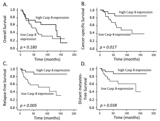 Overall survival (A), cancer-specific survival (B), relapse-free survival (C) and distant metastasis-free survival (D) according to caspase-8 expression (low: individual weighted score (WS) ≤ 6; high: individual WS > 6) in patients with cervical carcinoma treated with definitive CRT and BT.