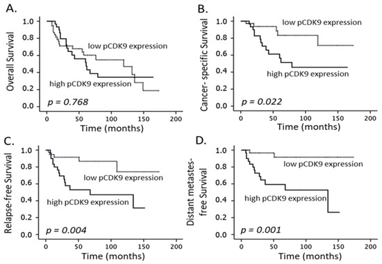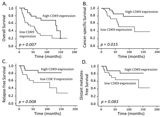Given that low CDK9 expression is associated with increased apoptotic cell death, spontaneous DNA damage, genetic instability [36,37,38,39], and impacts on the efficacy of DNA DSB repair [37,40], one may assume that patients with low CDK9 expression have more aggressive disease. Indeed, here, we report that low histochemical CDK9 detection correlates with increased relapse as well as distant metastasis rates and unfavorable CSS, in both the uni- and multivariate analyses. As for caspase-8, the prognostic/predictive value of CDK9, however, still remains controversial among different tumor types. Whereas some authors have indicated that high levels of CDK9 expression in patients with pancreatic adenocarcinoma are associated with significantly shortened OS, especially in well differentiated tumors [36,41,42], others have demonstrated that higher CDK9 expression is associated with significantly improved survival [43,44].