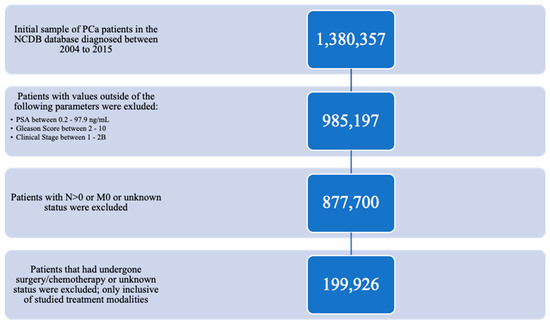 The years of diagnosis were grouped into periods from 2004–2007, 2008–2011, and 2012–2015. Age was stratified into groups of under 65, 65–69, 70–74, and over 74 years old. The patient’s race was defined as white, black, other, or unknown. Insurance was categorized as private, government (including Medicare, Medicaid, and other government), or no insurance. The Charlson–Deyo comorbidity index was recorded as the summation of comorbid conditions and was scored as 0, 1, 2, with a score of 0 representing no comorbid conditions recorded [32]. The 2013 U.S. Department of Agriculture Rural-Urban Continuum was used to define metropolitan, urban, and rural areas. Counties in metropolitan areas were coded as metropolitan, counties with an urban population of ≥2500 but not in a metropolitan area were termed urban, and counties with an urban population of <2500 were termed rural. Residential areas were stratified by median income into less than $38,000, $38,000–$47,999, $48,000–$62,999, and $63,000 and above; a small set of patients’ statuses was unknown. Similarly, the education level of the residential areas was clustered by the percentage of residents without a high school degree: <7%, 7–12.9%, 13–20.9%, >21%, and unknown. Distance from residence to the facility was calculated using the center of the patient’s zip code to the treating facility’s mailing address. Facilities were primarily separated on whether they were classified as academic/research-based or non-academic, with the status of 10 facilities unknown. Facility location was defined as Northeast: CT, MA, ME, NH, NJ, NY, PA, RI, and VT; South: AL, AR, DC, DE, FL, GA, KY, LA, MD, MS, NC, OK, SC, TN, TX, VA, and WV; Midwest: IA, IL, IN, KS, MI, MN, MO, ND, NE, OH, SD, and WI; and West: AZ, AK, CA, CO, ID, HI, MT, NM, NV, OR, UT, WA, and WY. Patients were classified based on their T-stage into Stage 1, 2, 2A, 2B, 3, 4, or unknown. Varying PSA levels (from 0.2 to greater than 74.9 ng/mL) were used to stratify patients into separate categories. Similarly, there was the utilization of the Gleason Score to divide patients into categories of <6, 6, 7, 8, 9, and 10. The use of hormone therapy towards PCa was of interest in the form of yes, no, or unknown.