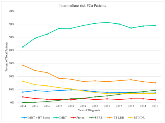 The pattern of utilization in these six radiation treatment modalities, across risk categories, was the first notable set of results identified in this study (Table 1). In the studied PCa patient population from the 2004–2015 NCDB database, IMRT was the most common modality in intermediate-risk (48,160; 56.8%), high-risk (32,851; 74.6%), and overall (106,246; 53.1%) patient groups. We speculate that IMRT’s popularity is due to its being a commonly available treatment modality and its toxicity control by sparing critical structures [7,15,33].