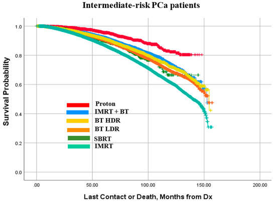 In intermediate-risk PCa populations, overall survival was significantly associated with patient races other than black or white and with increasing median incomes greater than $48,000. Those living 5–25+ miles from treatment facilities, academic or research facility type, and facilities located in the West were also associated with better outcomes. Similar to low-risk PCa populations, overall survival in proton therapy was closely followed by IMRT + BT boost, BT HDR, BT LDR, and SBRT. Increasing patient ages (greater than 65), urban/rural residential settings (vs. metro), residential areas with an increasing percentage of the population without a high school degree (greater than 7%), government-insured, increasing Charlson–Deyo comorbidity index (greater than 0), and the use of hormone therapy were associated with inferior outcomes.