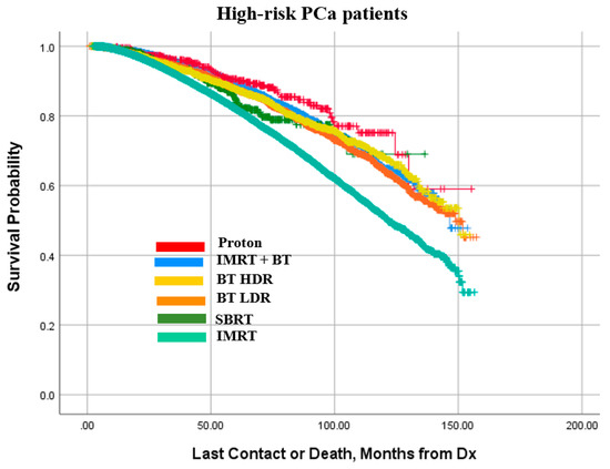 Kaplan–Meier survival curves for the low-, intermediate-, and high-risk PCa patients are presented in Figure 5, Figure 6 and Figure 7, respectively. It is observed that patterns of treatment effectiveness across the three risk groups are largely similar: proton exhibited a slightly better outcome. Meanwhile, the survival probabilities of the other four modalities (IMRT+BT, SBRT, BT LDR, and BT HDR) are very similar to one another. It is noted that although IMRT was the main treatment modality for high-risk patients (74.6%), compared to the rest of the patients being treated with the other five modalities combined (25.4%), the outcome pattern was mostly similar except for a slightly diminishing difference between proton and other modalities. A closer look into these plots reveals that 100 months OS probability is in the range of 80–92% for low-risk patients (Figure 5). The 100 months OS is estimated between 65–88% and 61–78% for intermediate-risk (Figure 6) and high-risk patients (Figure 7), respectively.