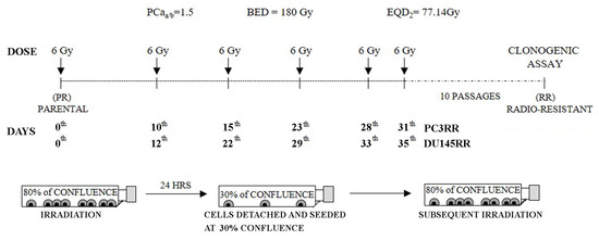 Development of radio-resistant PC3RR and DU-145RR cell lines. Representation of the radiation schedule used and the related radiobiological parameters. Growing PC3 and DU-145 cells at 80% of confluence were irradiated with the dose of 6 Gy. After 24 h, 30% of irradiated cells were re-seeded, and the next irradiation was repeated when a confluence of 80% was reached again. This protocol was applied six times in order to get a final equivalent dose (EQD2) that reached conventional fractionation of 77 Gy into daily doses of 2 Gy.
