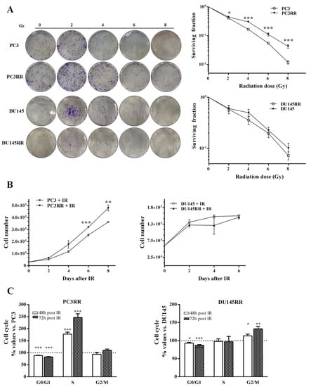 3.1. Development of PC3RR and DU-145RR Cancer Cell Lines and Characterization of Their Radiosensitivity
