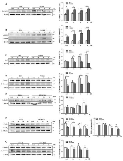 Compared to PC3, PC3RR basally expressed higher levels of cyclin D1, c-FLIP long (c-FLIPL) and c-FLIP short (c-FLIPS), both efficiently up-regulated by IR (Figure 4A,B). Moreover, PC3RR down-regulated BAX (Figure 4C) and restrained caspase 3 cleavage/activation following IR (Figure 4D). These data indicate that PC3RR cells exhibit more cancer-related survival markers, whereas no difference was detected between DU-145 and DU-145RR cells for proteins involved in anti-apoptotic/proliferative pathways, except for c-FLIPL, which was constantly lower in DU-145RR cells (Figure 4E–G). BAX protein was undetectable in either DU-145 or DU-145RR cells.