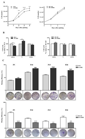 The basal proliferation rate, cell cycle distribution, ability to form colonies and cell migration were then assessed in PCaRR and PCa cells. Compared to PC3, PC3RR cells proliferated more efficiently from 2 to 4 days after plating (Figure 5A, 2 days: PC3RR 213,125 ± 15,464 vs. PC3 157,750 ± 9620; 3 days: PC3RR 309,125 ± 8475 vs. PC3 244,375 ± 12,736; 4 days: PC3RR 335,400 ± 13,496 vs. PC3 279,000 ± 9137). No statistically significant differences were observed between DU-145 and DU-145RR (Figure 5A, DU-145RR vs. DU-145). Cell cycle analysis performed at 24 h after plating revealed a significant increase in S phase in PC3RR cells compared to PC3 (Figure 5B, PC3RR vs. PC3), whilst no statistically significant differences were detected between DU-145 and DU-145RR cells (Figure 5B, DU-145RR vs. DU-145). Plating efficiency (PE), measuring the ability to form colonies, was increased in PC3RR (Figure 5C Passage (P) 5: PC3RR 47 ± 2% vs. PC3 39 ± 1%; P10: PC3RR 86 ± 3% vs. PC3 71 ± 2%; P15: PC3RR 87 ± 3% vs. PC3 60 ± 2%; P20: PC3RR 78 ± 4% vs. PC3 55 ± 2%) and decreased in DU-145RR (Figure 5C P5: DU-145RR 22 ± 1% vs. DU-145 60 ± 3%; P10: DU-145RR 38 ± 1% vs. DU-145 21 ± 1%; P15: DU-145RR 18 ± 1% vs. DU-145 27 ± 2%; P20: DU-145RR 21 ± 2% vs. DU-145 42 ± 5%), in both cases stably up to the 20th passage.