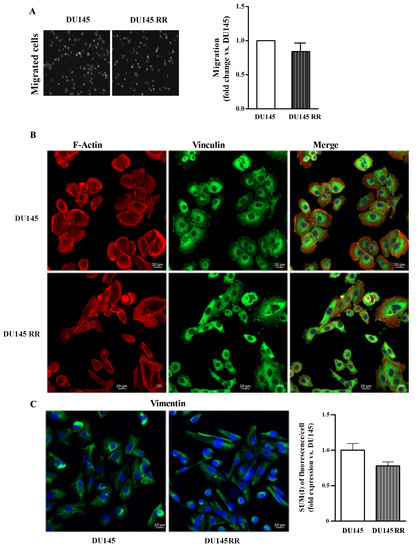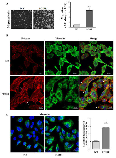 The migratory ability and the histological characterization of the cytoskeletal migration-related proteins were investigated by means of trans-well migration in vitro assays and immunofluorescence, respectively. As shown in Figure 6A, migration was enhanced in PC3RR compared to PC3 cells (Figure 6A, PC3RR vs. PC3). In accordance, confocal analysis highlighted a different cytoskeletal organization between PC3 and PC3RR cell lines. Indeed, in PC3RR F-actin forms peripheral cortical bundles, stress fibers, lamellipodia and filopodia structures that are less evident in PC3 cells (Figure 6B). Moreover, vinculin in PC3 cells is mostly cytoplasmatic, while in PC3RR cells, we observed several spots on the cellular membrane that colocalized with F-actin in focal adhesions (Figure 6B). Finally, PC3RR appeared remarkably enriched in vimentin (Figure 6C left) according to the fluorescence intensity analysis, reported as SUM (I)/cell (PC3RR 2.83 ± 0.5 vs. PC3 1± 0.12) (Figure 6C right).