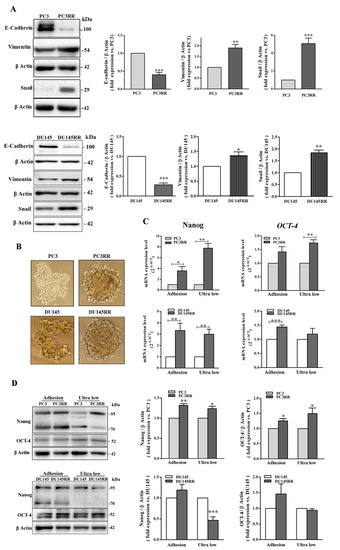 Evaluation of epithelial–mesenchymal transition and stem cell markers in parental PCa and PCaRR cell lines. (A) Whole cell extracts were analyzed using Western blot for the indicated epithelial or mesenchymal markers. Each blot is representative of at least three. The histograms represent the densitometric analysis of the Western blot, showing fold expression of each protein normalized with β-Actin (parental PC3 and DU-145 cell value set as one). Data are from at least three separate experiments. (B) Phase contrast micrographs of PC3/PC3RR and DU-145/DU-145RR cells cultured in anchorage-independent conditions for 96 and 48 h, respectively. (C) The histograms represent the mRNA expression of OCT-4 and Nanog genes assayed by RT-qPCR in PC3/PC3RR and DU-145/DU-145RR cells after 96 and 48 h in adherent or anchorage-independent (ultra-low) conditions, respectively. (D) Western blot of PC3/PC3RR and DU-145/DU-145RR cells in the same conditions as in (C). Each blot is representative of at least three experiments. The histograms show the densitometric analysis of Western blots, representing the fold expression of the OCT-4 or Nanog (parental PC3 and DU-145 cells value set as one). β-Actin was used as the control for equal amounts of loaded proteins. Data represent the mean ± S.E.M. derived from at least three independent experiments; PC3RR vs. PC3 and DU-145RR vs. DU-145, * p < 0.05; ** p < 0.01; *** p < 0.001, Student’s unpaired t-test.