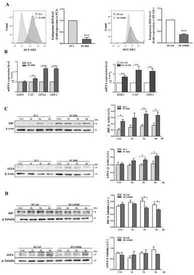 Antioxidant response and UPR activation induced by IR in PC3RR and DU-145RR cells. (A) Endogenous ROS levels in parental PCa and PCaRR were measured with flow cytometry using DCFDA dye fluorescence. The graphs represent the fold expression of ROS levels, in which the median of fluorescence of parental PC3 or DU-145 cells is set as one. The values are from three independent experiments. Representative flow cytometry histograms are shown. (B) The mRNA levels of the indicated genes were quantified by qRT-PCR, and β-Actin was used as an internal control. To evaluate UPR pathway, Western blot analysis was performed on cell lysates from unirradiated cells (Ctrl) or cells irradiated with 4 Gy and collected 1, 3 and 6 h after IR in PC3/PC3RR (C) DU-145/DU-145RR (D). β-Actin or α-Tubulin were used as internal controls. Each blot is representative of three experiments. The histograms represent the densitometric analysis of three separate Western blots evaluated as arbitrary units (A.U.). Data represent the mean ± S.E.M. derived from at least three independent experiments. PC3RR vs. PC3 and DU-145RR vs. DU-145; * p < 0.05, ** p < 0.01, *** p < 0.001, Student’s unpaired t-test.