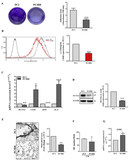The ability to adhere to type I collagen, the most abundant component of organic extracellular matrix in bone tissue, and the expression of the α2 subunit of type I collagen receptor α2β1 were assessed on bone-metastasis-derived PC3 and PC3RR. As shown in Figure 10A, compared to PC3, PC3RR cells adhered to type I collagen (Figure 9A) and down-regulated the expression of α2 subunit less efficiently(Figure 10B). The expression of the master transcription factor of osteoblast differentiation, runt-related transcription factor (RUNX2), osteoclast function-related cathepsin K (CTSK), osteoclastogenesis inhibitory factor osteoprotegerin (OPG) and interleukin-6 (IL-6) was investigated using RT-qPCR. Compared to PC3, PC3RR cells expressed lower levels of RUNX2 and OPG mRNA and higher of CTSK and IL-6 (Figure 10C). The lower expression of RUNX2 in PC3RR cells was also confirmed using Western blot (Figure 10D). A mineralization assay shows that PC3RR released mineralized nodules less efficiently, as revealed by Von Kossa staining (Figure 10E). To investigate the ability of tumour cells to support osteoclastogenesis, we treated peripheral blood mononuclear cells (PBMC) isolated from healthy donors with a conditioned medium (CM) isolated from PC3 and PC3RR cells. As shown in Figure 10F, no statistically significant differences were detected in the ability to regulate osteoclast differentiation between PC3 and PC3RR cells. These results suggest that PC3RR cells are likely more prone to leave the bone, consistent with their mesenchymal features. The result is that they promote osteolytic lesions more efficiently compared to PC3 cells. Moreover, enhancer of zeste homologue 2 (EZH2) has been recently implicated as a master regulator of secondary metastases from bone lesions [49]. Thus, we assessed EZH2 expression level using RT-qPCR, and Figure 10G shows a higher EZH2 expression in PC3RR cells compared to parental cells.