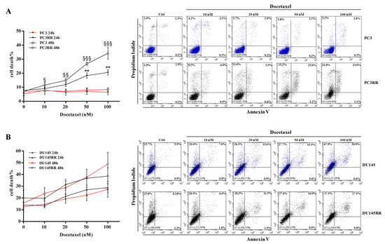 Metastatic patients are usually treated with hormonal therapy, but when cancer cells become unresponsive, other strategies must be used, such as chemo or radiation therapy, sometimes with palliative intent [50]. Therefore, we examined sensitivity patterns to Docetaxel treatment in the parental cell lines and in the corresponding radiation-resistant ones. To this aim, we treated parental PCa and PCaRR cells with increasing doses of Docetaxel for 24 and 48 h, and then we performed flow cytometry analysis by Annexin-V/PI staining to evaluate the apoptotic/necrotic cell percentage. As shown in Figure 11, Docetaxel treatment of PC3RR induces a significant increase in the percentage of cell death at 50–100 nM after 24 h, and at all doses after 48 h, compared with parental PC3 (Figure 11A). The percentage of necrotic and early/late apoptotic cells, at all Docetaxel doses and at all times tested, is detailed in supplementary Table S2. Conversely, a similar rate of cell death was observed in DU-145 and DU-145RR at all doses tested (Figure 11B).