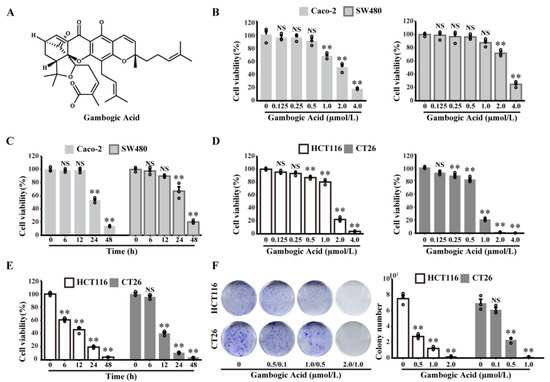 GA decreases Caco-2, SW480, HCT116, and CT26 cell viability in dose- and time-dependent manners. (A) Chemical structure of GA. (B) Caco-2, SW480, (D) HCT116, and CT26 cells were treated with GA (0–4 μmol/L) for 24 h, and cell viability was analysed by the CCK8 assay. (C) Caco-2 and SW480 cells were treated with GA (2 μmol/L) for different times, and cell viability was analysed by the CCK8 assay. (E) HCT116 and CT26 cells were treated with GA (2 μmol/L and 1 μmol/L, respectively) for different times, and cell viability was analysed by the CCK8 assay. (F) HCT116 and CT26 cells were treated with the indicated concentrations of GA and stained with crystal violet. The cells were exposed to 0.1% DMSO as control. All experiments were repeated three times, and results were expressed as mean ± SD. NS, not significant, ** p < 0.01 vs. control.