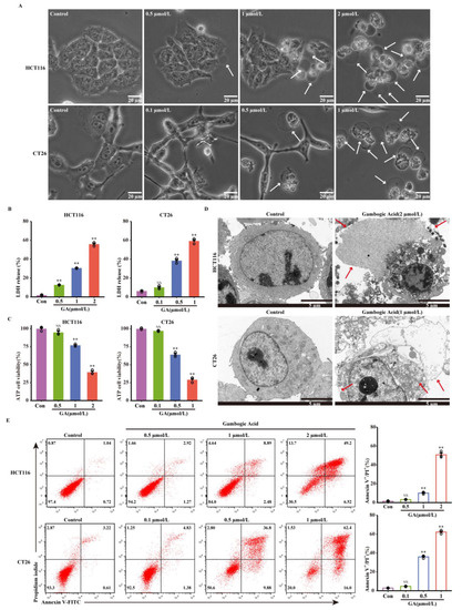 Since decreased cell viability can also be caused by pyroptosis, the ability of GA to trigger pyroptosis was investigated in this study. First, morphological alterations were monitored in HCT116 and CT26 cells after exposure to GA at different concentrations. As demonstrated in Figure 2A, the obvious morphological alterations, including large bubbles from the cellular membrane and cellular swelling, were observed in response to GA treatment; these changes were distinct from classic morphological changes observed during apoptosis and were consistent with changes in cell morphology during pyroptosis. Classic pyroptotic morphological features, including large bubble structure formation and cellular membrane rupture, were also observed by TEM, as shown in Figure 2D. Second, to verify cell membrane rupture and intracellular content leakage, adenosine triphosphate (ATP) cell viability assays and LDH release assays were performed. As shown in Figure 2B,C, HCT116 and CT26 cells treated with GA released LDH and exhibited decreased intracellular ATP levels. In pyroptotic cells, propidium iodide (PI) can enter cells through pores that form in the cellular membrane and then stain the nuclei [24]. Thus, the pyroptosis of these cells was further investigated by flow cytometry analyses of Annexin V-FITC and PI staining. The flow cytometry analysis results showed that the number of Annexin V-FITC/PI positive HCT116 and CT26 cells was increased in response to GA exposure in a dose-dependent manner (Figure 2E). Collectively, these results indicated that GA could induce the pyroptosis of HCT116 and CT26 CRC cells.