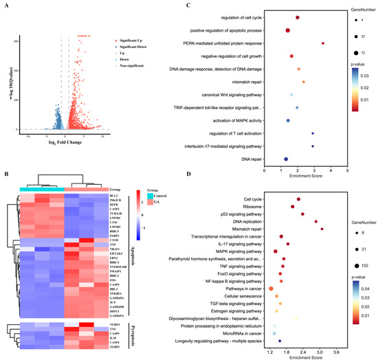 RNA sequencing analysis. (A) Volcano plots of differentially expressed genes of HCT116 cells in response to 2 μmol/L GA for 12 h. (B) Heatmap analysis of differentially expressed genes involved in apoptosis and pyroptosis. (C) GO and (D) KEGG enrichment in GA-treated HCT116 cells and control cells. The cells were exposed to 0.1% DMSO as control.