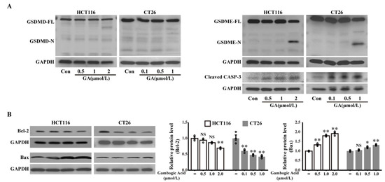 GSDME, rather than GSDMD, was involved in GA-induced pyroptosis in CRC cells. (A) Expressions of GSDMD, GSDME, and cleaved caspase-3 in HCT116 and CT26 cells treated with GA for 12 h were analysed by western blotting. (B) The expressions of Bcl-2 and Bax in HCT116 and CT26 cells treated with GA were analyzed by western blotting. The cells were exposed to 0.1% DMSO as control. All experiments were repeated three times and results were expressed as mean ± SD. CASP-3, caspase-3, Con, control, NS: not significant. NS p > 0.05 vs. control, * p < 0.05 vs. control, ** p < 0.01 vs. control. The whole western blots were shown in Figure S3.