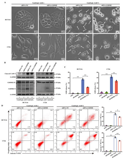 Both GSDMD and GSDME, which are important pyroptosis substrates, can be cleaved by activated caspases to trigger pyroptosis [6,9,25]. Thus, to investigate whether GSDMD and GSDME are required for GA- triggered pyroptosis, we examined the expression of these proteins and their N-terminal domains in HCT116 or CT26 cells after treatment with different doses of GA. As demonstrated in Figure 4A, western blotting analysis showed that GSDMD was expressed in HCT116 and CT26 cells, but no cleavage of GSDMD was observed. The results indicated that GSDMD is not involved in GA-induced pyroptosis in HCT116 or CT26 cells.