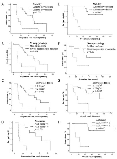 - Deluche, E.; Leobon, S.; Lamarche, F.; Tubiana-Mathieu, N. First validation of the G-8 geriatric screening tool in older patients with glioblastoma. J. Geriatr. Oncol. 2019, 10, 159–163. [Google Scholar] [CrossRef]