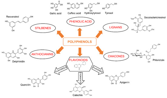 In 2010, the Food and Agriculture Organization (FAO) defined “sustainable diets” the “diets with low environmental impacts, which contribute to food and nutrition security and to healthy life for present and future generations” [4]. Currently, about one third of the food placed on the market is wasted since it is considered not useful for the supply. The definition of “food waste” acquires a negative meaning, not only because of the economic and environmental implications, but also because these products might have potential and could be useful for the recovery of valuable components, thus assuming the connotation of “food by-products” [5]. These products could become part of the circular economy, recovering the percentage of by-products lost [6]. In particular, agri-food by-products have been increasingly considered for the extraction of new nutraceuticals, functional foods, and food additives, which could increase the quantity and quality of natural bioactive compounds available and contribute to the development of sustainability [7]. Peel, seeds, shells, pomace, and leaves contain bioactive compounds (e.g., phenols, antioxidants, anthocyanins, carotenoids, fatty acids, and peptides) as well as fibers and enzymes employed in the production of enriched food, cosmetics, and drugs by pharmaceutics companies [8,9]. Great attention is given to polyphenols or phenolic compounds (PhCs) that have a preventive role in inflammation as well as chronic diseases related to oxidative stress, because of their scavenger activity [10]. Dietary polyphenols constitute one of the most numerous groups of natural products. They are all characterized by a common chemical structure comprising an aromatic ring with one or more hydroxyl substituents, but the natural products belonging to this category are very heterogeneous and can be divided into several classes. The main groups include flavonoids, phenolic acids, lignans, chacones, stilbenes, and anthocianins (Figure 1). Variations in the position and nature of the substituents in the aromatic hydrocarbon backbones lead to a variety of molecules.