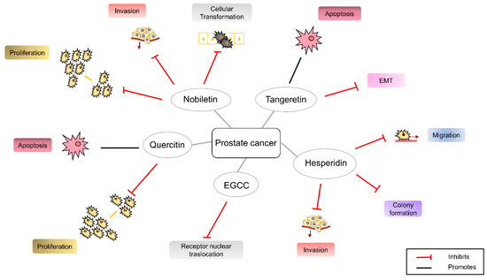 The PMFs induce human cancer cell apoptosis through different mechanisms and signaling pathways also depending on the cell type. In gastric adenocarcinoma cells, for example, they promote an autophagic cell death inducing cytoplasmic vacuoles and autophagosomes. This process involves the PI3K/Akt/mTOR pathway downregulation, the p21 upregulation, the activation of Beclin 1 and LC3B, and the activation of MAPKs [168]. In addition, its metabolites, such as 30-demethylnobiletin (30-DMN), 40-demethylnobiletin (40-DMN), 30,40-didemethylnobiletin (30,40-DMN) are promising antitumoral agents, since they significantly inhibit cell proliferation, cause cell-cycle arrest, induce apoptosis, and negatively modulate the signaling cascade linked to cell proliferation and cell death [169]. Current studies are involved to deepen the beneficial synergistic effects exerted by the concomitant administration of nobiletin and its metabolites or nobiletin and other drugs which would seem very hopeful in inhibiting inflammation, cell cycle progression, angiogenesis, and metastasis [170].