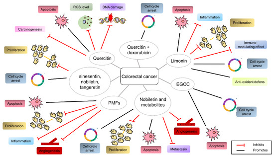 Peel and seeds of citrus species contain phytochemicals promising to be employed in CRC therapy protocols as chemopreventive and chemotherapeutic agents. Citrus has been shown to modulate the inflammation and immune responses and suppress cellular oxidative stress, promoting Nrf2 transcriptional activity and reducing NF-kB, p53 and STAT3 transcriptional activity [164]. Citrus peels are rich in polymethoxyflavones (PMFs), whose role in gastrointestinal cancer have been widely investigated in several in vitro and in vivo models. The most effective PMFs, sinesentin, nobiletin, and tangeretin, are able to inhibit the proliferation of human CRC cells in 3D models, arrest the cell cycle in G1 or G2 phases through the upregulation of p21 and p27, as well as the inhibition of CDK-2 and CDK-4 [165]. They also promote the apoptosis of colon cancer cells [166,167], without affecting the surrounding normal cells [106].
