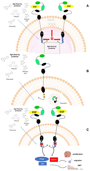 The putative mechanisms of action of agri-food by-products derivatives on EGFRs. Natural derivatives (e.g., flavonoids, phenolic acids, and phenols in (A–C) affect the EGFR signaling through different mechanisms. (A) They directly impair EGFR tyrosine autophosphorylation and its tyrosine kinase activity (TK) or indirectly affect EGFR dimerization by interfering in the cellular membrane bilayer fluidity. The membrane stiffness prevents EGFR diffusion and dimerization, with a negative effect on the TK resulting activation. (B) Polyphenols downregulate EGFR expression through protein ubiquitination and degradation. (C) By inhibiting EGFR-TK domain, natural compounds impair the EGF-induced PI3K/Akt and -MAPK signaling cascades. These effects halt cellular migration, proliferation, and EMT.