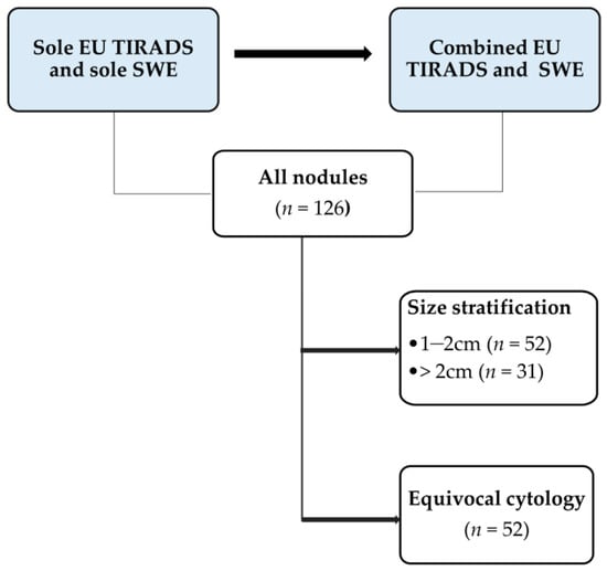 A stepwise approach was used to analyse the images based on each ultrasound modality used. The initial step involved analysing all thyroid nodules using grey scale ultrasound and SWE. Images were then distributed into relevant subcategories based on the nodule size stratification and equivocal cytology status. Figure 2 illustrates the analysis sequence and criteria. Nodules that had FNAC classifications 3 and 4 (atypia of undetermined significance or follicular lesion of undetermined significance-AUS/FLUS; and suspicion of follicular neoplasm or follicular neoplasm-SFN/FN, respectively) were considered equivocal [23,24]. The sole grey scale ultrasound assessment was based on EU TIRADS at a pre-determined cut-off point of high suspicion of malignancy (category 5).