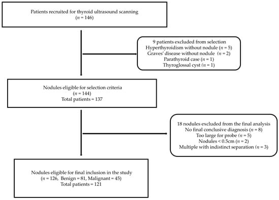 A total of 126 thyroid nodules (81 benign and 45 malignant) from 121 patients (100 females and 21 males) were included in the present study. Figure 3 shows the patient and thyroid nodule selection steps and exclusion reasons.