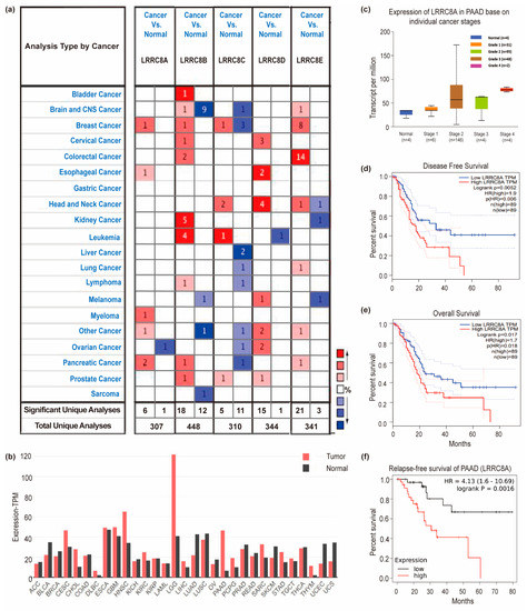 Bioinformatics analyses of LRRC8A in PAAD. (a) Pan-cancer analysis of LRRC8A–E expression by ONCOMINE; (b) the expression of LRRC8A in PAAD was seven-fold higher than that in normal by GEPIA, Tumor (n = 179), Normal (n = 171); (c) LRRC8A expression in PAAD based on individual cancer stages; (d,e) the DFS and OS of patients with PAAD with a high LRRC8A expression were significantly worse than those with a low LRRC8A expression; (f) the RFS of patients with PAAD with a high LRRC8A expression were significantly worse than those with a low LRRC8A expression.