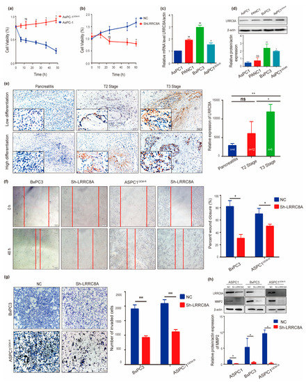 To evaluate the potential role of LRRC8A in PAAD, qRT-PCR and western blotting were used to detect the expression of LRRC8A in PAAD cell lines AsPC-1, PaNC-1, and BxPC-3. The sequence of cell migration and invasion capacity, angiogenic potential, and tumorigenicity was reportedly BxPC-3 > AsPC-1 > PaNC-1 [25]. A similar mRNA and protein expression gradient of LRRC8A in PAAD cell lines was also observed in Figure 2c,d, respectively. The immunohistochemical analysis of pathological sections obtained from patients with PAAD demonstrated that a high LRRC8A expression was correlated to the tumor grade of PAAD (Figure 2e). To investigate whether LRRC8A affects the migration and invasion abilities of PAAD cells, a wound healing assay with or without LRRC8A knockdown was conducted using AsPC-1GEMR and BxPC-3 cells as showed in Figure 2f, and a transwell invasion assay using AsPC-1 and BxPC-3 cells with or without LRRC8A knockdown were performed in Figure 2g. Results showed a substantial inhibitory effect of LRRC8A knockdown on PAAD cell migration and invasion (Figure 2f,g). Further investigation showed LRRC8A knockdown resulted in the decreased protein expression of EMT markers, such as MMP2 in PAAD cell lines (Figure 2h).