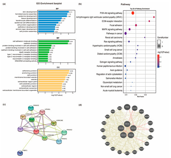 The above-mentioned findings suggest that LRRC8A is a promising prognostic biomarker of PAAD. Therefore, it would be crucial to explore the potential relevance and underlying mechanisms of LRRC8A expression in patients with PAAD. Next, the LRRC8A co-expression and its network in patients with PAAD were explored, and the potential co-expression of LRRC8A genes was analyzed using eBioPortal. In PAAD database (TCGA, Firehose Legacy), the top 50 positively correlated genes of LRRC8A were imported to OmicShare to analyze the GO enrichment and KEGG pathways (Figure 3). Figure 3a shows that biological processes, including skin development, hemidesmosome assembly, epidermis development, tissue development, keratinocyte differentiation, epidermal cell differentiation, and cell junction, were associated with the tumorigenesis and progression of PAAD. Cell adhesion molecule binding, cadherin binding, protein binding involved in cell–cell adhesion, protein binding involved in cell adhesion, cadherin binding involved in cell–cell adhesion, and death receptor binding were the most highly enriched molecular functions, whereas adherence junction, anchoring junction, cell junction, membrane-bound vesicles, vesicles, extracellular region, and cell–substrate junction were the most highly enriched cellular components. Based on the KEGG pathway analysis, the phosphoinositide 3-kinase (PI3K)-Akt signaling pathway, focal adhesion, arrhythmogenic right ventricular cardiomyopathy, extracellular membrane–receptor interaction, and mitogen-activated protein kinase signaling pathway were significantly associated with the tumorigenesis and progression of PAAD (Figure 3b). Moreover, given that LRRC8A co-localizes with LRRC8B–E in cells, it is necessary to analyze the PPI network of LRRC8A–E (Figure 3c), the gene–gene interaction network of LRRC8A–E, and the top 50 positively correlated genes of LRRC8A (Figure 3d).