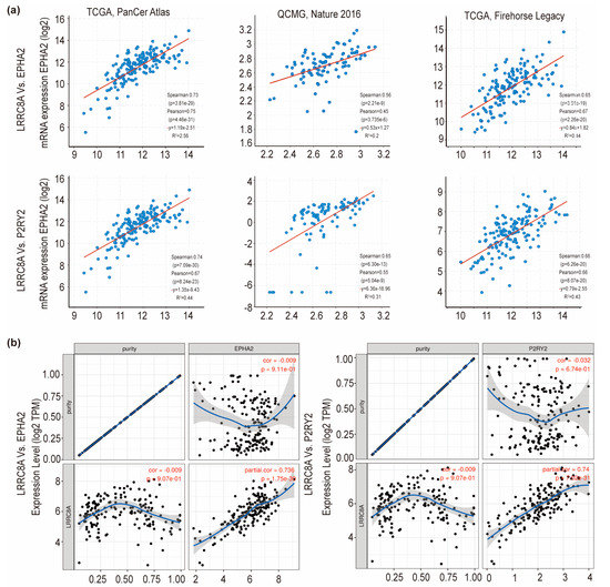 Correlation analysis of LRRC8A with P2RY2 and EPHA2 in PAAD. (a) LRRC8A showed a positive correlation with P2RY2 and EPHA2 in cBioPortal; (b) LRRC8A showed a positive correlation with P2RY2 and EPHA2 in TIMER.