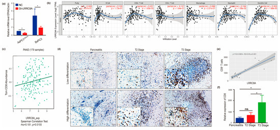 Interestingly, the co-expression analysis of LRRC8A in PAAD samples showed that purinergic receptor P2Y2 (P2RY2) and ephrin-A receptor 2 (EPHA2) showed a positive correlation with LRRC8A in most database of PAAD, including those of TCGA (PanCancer Atlas and Firehose Legacy), QCMG (Nature 2016) [26], and TIMER (Figure 4). P2RY2 was reported to enhance cancer cell glycolysis by PI3K/AKT-mammalian target of rapamycin (mTOR) signaling, resulting in PAAD progression [27]. However, EPHA2 was reportedly involved in multiple immunity regulation pathways of PAAD [28,29]. The mRNA expression level of EPHA2 decreased considerably when LRRC8A was knocked down in AsPC-1GEM-R and BxPC-3 cells (Figure 5a). Recent studies showed that LRRC8A has a novel role in immune regulation [20,30]; therefore, whether its expression was correlated with immune infiltration levels using TIMER was investigated (Figure 5b). Results showed that LRRC8A expression was significantly correlated with CD8+ T cells (p = 1.83 × 10−3), neutrophils (p = 1.58 × 10−2), and dendritic cells (p = 7.88 × 10−3). Similarly, a correlation analysis of LRRC8A and CD8+ T cells in PAAD (179 samples) using the TISIDB database also showed that LRRC8A expression was significantly correlated with CD8+ T cells (ρ = 0.181, p = 0.0155) (Figure 5c). Further immunohistochemical results of pathological sections obtained from patients with PAAD showed that LRRC8A expression was correlated with CD8 expression (Figure 5d–f), with a correlation coefficient (R2) of 0.83. These findings suggest that LRRC8A affects the patient clinical outcomes by interacting with immune infiltration, especially CD8+ T cells in PAAD. It should be noted that LRRC8C was significantly correlated with B cells (p = 1.67 × 10−7), CD8+ T cells (p = 2.22 × 10−16), CD4+ T cells (p = 8.02 × 10−5), macrophages (p = 7.21 × 10−26), neutrophils (p = 5.30 × 10−20), and dendritic cells (p = 3.14 × 10−27) (Supplementary Figure S2).