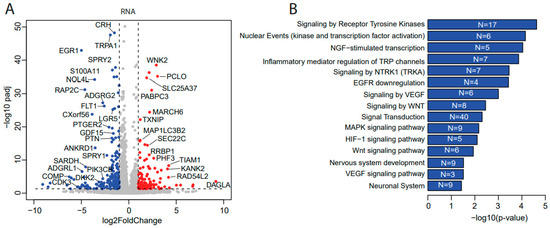 To uncover how ulixertinib inhibits cell proliferation in NB, we performed a genome-wide transcriptomic analysis with RNA-Seq in ulixertinib-treated NB cells (Figure 3A). This analysis revealed 120 upregulated and 187 downregulated genes in response to ulixertinib treatment compared to the controls (Figure 3A and Table S1). Gene set enrichment analysis by the over-representation test has revealed inhibition of multiple pathways and their cross-talks (Figure 3B,C). As expected, MAPK signaling was significantly decreased as well as EGFR, VEGF, and WNT signaling pathways, demonstrated by multiple shared key components (Figure 3C, left panel). Overexpression and dominance of these survival pathways drive NB tumorigenesis and the malignant transformation [30,31]. NGF-stimulated transcription and NTRK1 signaling (Figure 3C, right panel) are the other two pathways significantly inhibited by ulixertinib, both of which are required for neuronal growth or nervous system development [32]. Among the upregulated genes, MBNL2 [33], SEPT4 [34], REPS2 [35], OTUD5 [36], and TXNIP [37] were shown to play a tumor-suppressive role in many tumors. To determine the correlation between these upregulated genes with NB patient prognosis, we analyzed NB patient datasets in the R2 database (https://hgserver1.amc.nl/cgi-bin/r2/main.cgi, access on 1 April 2021) and found that decreased expression of these genes predicted a significantly poor outcome (Supplementary Figure S1). These results suggest that these genes upregulated by ulixertinib treatment exert a tumor-suppressive function in NB cells.