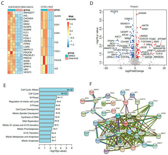 Transcriptomics and proteomics reveal ulixertinib-induced gene changes in NGP cells. (A) The differentially expressed genes revealed by DESeq2 analysis of RNA-Seq read counts. They are represented in the volcano plot in terms of their measured expression change (log2 of fold changes, x-axis) and the significance of the change (−log10 of adjusted p values, y-axis). The dotted lines represent the thresholds to define the differentially expressed genes. Red dots are up-regulated genes after the drug treatment (fold changes ≥ 2 and adjusted p < 0.05). Blue dots are down-regulated genes with the drug treatment (fold changes ≤ 0.5 and adjusted p < 0.05). (B) Top inhibited pathways revealed by down-regulated genes from RNA-Seq. N is number. (C) Key components inhibited and their associated pathways. (D) The differentially expressed proteins from MS were represented in the volcano plot in terms of their measured expression change (log2 of fold changes, x-axis) and the significance of the change (-log10 of p values, y-axis; unpaired t-test). The dotted lines represent the thresholds to define the differentially expressed proteins. Red dots are up-regulated proteins after the drug treatment (fold changes ≥ 2 and p < 0.05). Blue dots are down-regulated proteins with the drug treatment (fold changes ≤ 0.5 and p < 0.05). (E) Top inhibited pathways revealed by downregulated proteins from MS. N is number. (F) Protein–protein interaction networks analysis of down-regulated proteins from MS.