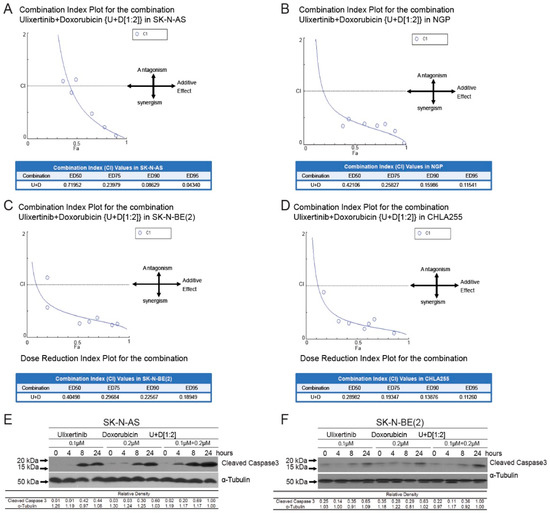 Ulixertinib enhances the anti-tumor activity of doxorubicin in human neuroblastoma cells. (A–D) CI plots for SK-N-AS, NGP, CHLA255, and SK-N-BE (2). Four NB cell lines, including SK-N-AS (A), NGP (B), SK-N-BE(2) (C), and CHLA255 (D) cells, were treated with ulixertinib, doxorubicin, and their combinations at a ratio of 1:2 respectively, for 72 h. The combination index (CI) values were calculated by the Chou–Talalay method for drug interactions using Compusyn software. Values of CI < 1, =1, and >1 indicate synergism, additive effects, and antagonism, respectively. The obtained CI values for the combination of ulixertinib and doxorubicin at different effective doses (ED50, ED75, ED90, and ED95). (E,F) SK-N-AS (E) and SK-N-BE(2) (F) cells were treated with either doxorubicin alone, ulixertinib alone, or their combinations for 4 h, 8 h, and 24 h. Then the whole-cell lysates were subjected to SDS-PAGE and immunoblotted with the cleaved-caspase 3 antibody. α-tubulin was used as a loading control in all samples. Gel densitometrical analysis was performed using ImageJ software (https://imagej.nih.gov/ij/index.html, accessed on 25 October 2022).