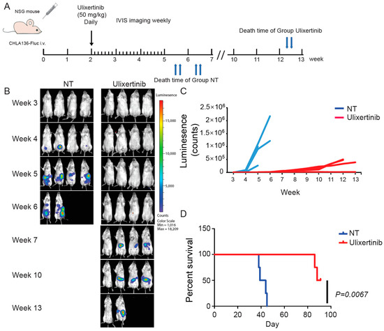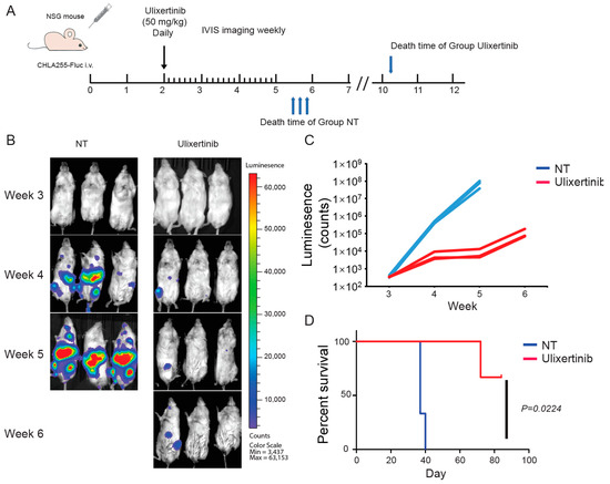 To further evaluate the therapeutic potential of ulixertinib in treating NB, we tested its effect on tumor growth using two xenograft NB mouse models. We used CHLA136-Fluc (MYCN amplified) and CHLA255-Fluc (c-Myc overexpressed) to generate these xenograft mouse NB tumor models. Randomized mice were grouped in different cohorts and treated with ulixertinib or vehicle daily for three weeks (Figure 5A and Figure 6A). Ulixertinib daily injection was well tolerated at a concentration of 50 mg/kg without apparent bodyweight loss and other adverse effects. We found that treatment with ulixertinib significantly inhibited the overall NB tumor growth compared to vehicle (Figure 5B,C and Figure 6B,C). We also found that ulixertinib-treated xenograft NB mice survived significantly longer when compared to control mice (Figure 5D and Figure 6D). Overall, this data clearly demonstrate the potency and efficacy of ulixertinib in inhibiting NB tumor growth and prolonging overall survival.