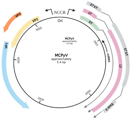 The genomic map of MCPyV circular, double stranded DNA. The early genes encode oncogenic proteins (LT, sT, 57 kT) and the late genes structural proteins (VP1. VP2, VP3). The NCCR (non-coding control region) includes Ori and regulates the viral gene expression. A gene, located on the late strand of the T antigen genes, with an opposite transcription orientation (reversed complementarity) to the T antigens produces a non-coding miRNA. The total length of the viral genome is approximately 5.4 bp. Created with BioRender.com (visited on 1 July 2022).