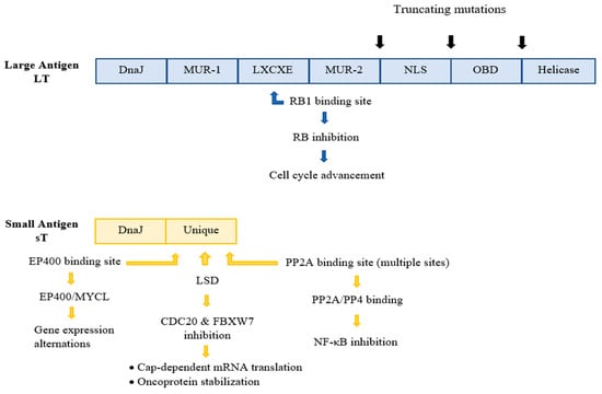 - Baez, C.F.; Brandão Varella, R.; Villani, S.; Delbue, S. Human Polyomaviruses: The Battle of Large and Small Tumor Antigens. Virology 2017, 8, 1178122X17744785. [Google Scholar] [CrossRef] [PubMed]