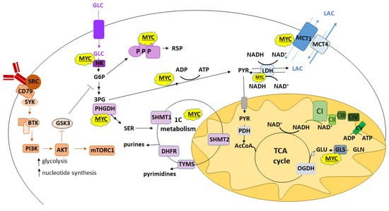 The transcription factor MYC is well established as a master regulator of metabolism and proliferation, where it upregulates many genes involved in glycolysis, glutaminolysis and mitochondrial metabolism (Figure 1) [40]. MYC translocations are a hallmark of BL and MYC is expressed in almost half of DLBCL cases [41,42]. Furthermore, MYC translocations are a poor prognostic factor in DLBCL in association with BCL2 and/or BCL6 translocations, and MYC re-arrangements are also a driver of high-grade transformation in follicular lymphoma (FL) and chronic lymphocytic leukemia (CLL) [43]. An interesting model for the study of early MYC-linked B-cell transformation events was reported in EBV-infected primary B-cells, which observed increases in glycolysis, serine import and de novo serine synthesis, and mitochondrial one-carbon (1C) metabolism. The importance of this goes beyond EBV-driven lymphomas as MYC overexpression was able to induce similar changes in 1C metabolism even when the EBV-encoded viral factor EBNA2 was inactivated [44].