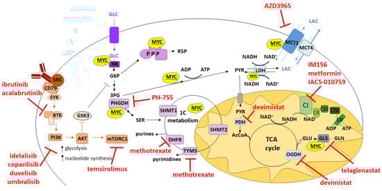 The effector of PI3K signaling and cellular metabolic sensor, mTORC1, is dysregulated in several lymphomas (including DLBCL and FL) and has been studied extensively as a therapeutic target [19,89]. Its inhibitors, rapalogs, unfortunately showed limited clinical efficiency in DLBCL and have only been approved for refractory/relapsed mantle cell lymphomas so far [89]. As rapalogs have a cytostatic effect as monotherapy, it has been suggested that the cellular metabolic adaptations induced by the treatment might in turn be effectively targeted by co-inhibition of signaling or metabolic pathways upstream or downstream of mTORC1 [89]. These include already-approved drugs such as ibrutinib to inhibit BCR signaling or antimetabolites that inhibit nucleotide synthesis as well as drugs that inhibit mitochondrial respiration or glutaminolysis [89]. In one small but provocative study, three out of four patients with refractory DLBCL achieved complete remission (CR) in response to a combination of the mTOR inhibitor temsirolimus, with L-asparaginase and metformin to inhibit glutamine and the respiratory chain respectively [60].