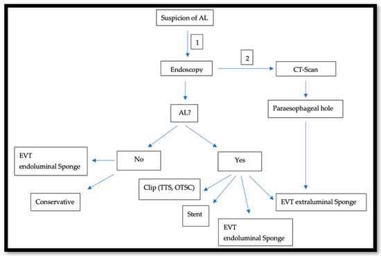 Early diagnosis is essential for the success of the treatment. Any deviation from the norm in the postoperative period needs be investigated to exclude AL or to promptly treat it once confirmed. Although the majority of patients present classic signs of infection such as elevated C-reactive protein (CRP), procalcitonin and/or leukocytosis, tachycardia and fever, or an abnormal drainage discharge (saliva or bile), one should not overlook a new onset of atrial fibrillation or postoperative delirium [18]. The following diagnostic tools/methods are used: endoscopic intervention [19], esophagogram using water-soluble contrast, computer tomography (CT-Scan) with oral (oc) and intravenous (iv) contrast, or oral uptake of methylene blue [20].