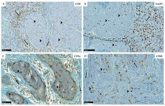 Immunohistochemical representation of CD8 (A), FoxP3 (B), CD1a (C) and CD68 (D) expression (scales = 100 µm) in stromal (arrows) and intratumoral (arrowheads) areas of oropharyngeal carcinomas. Bars = 100 µm.